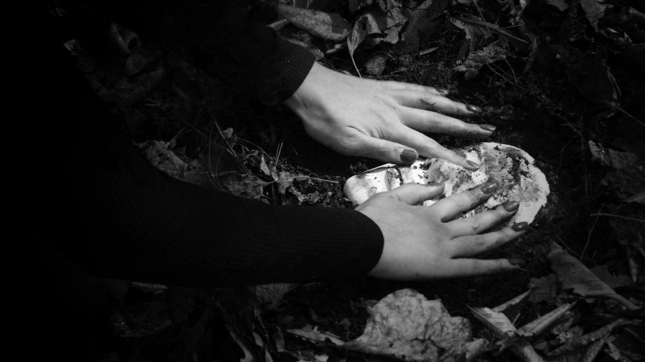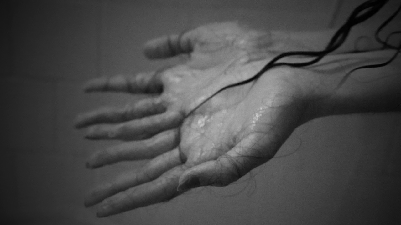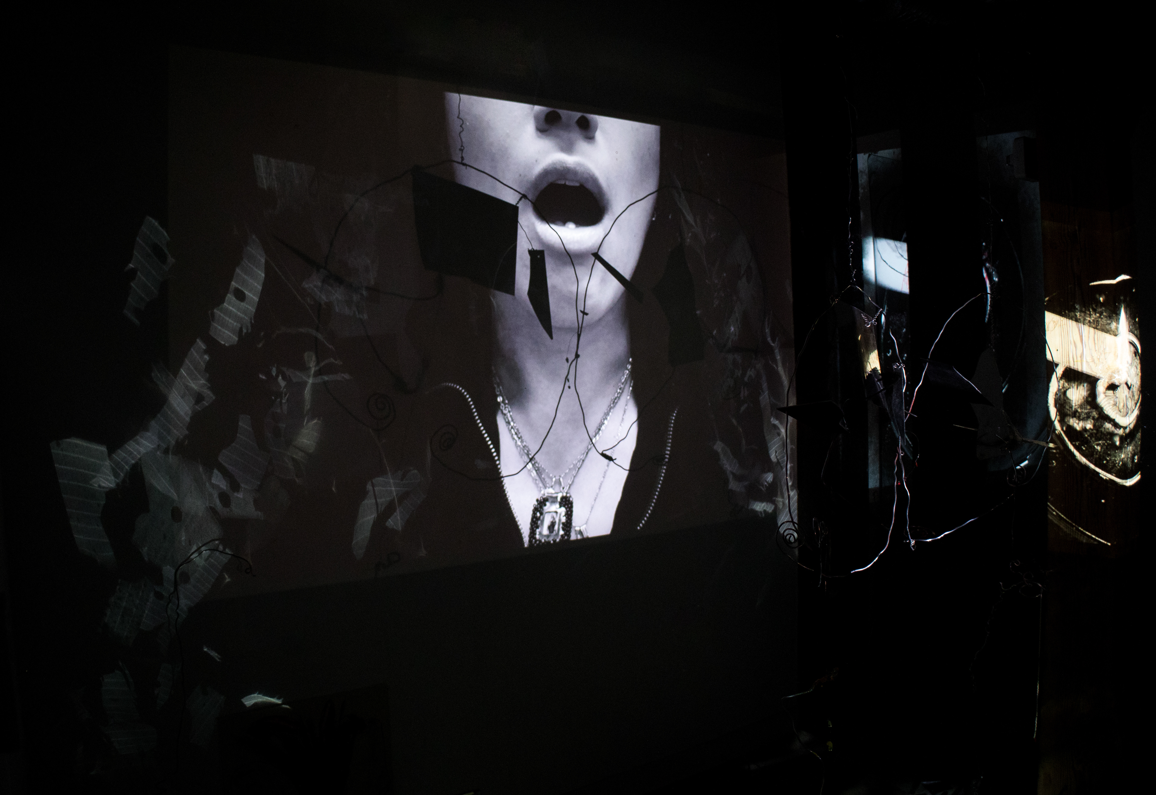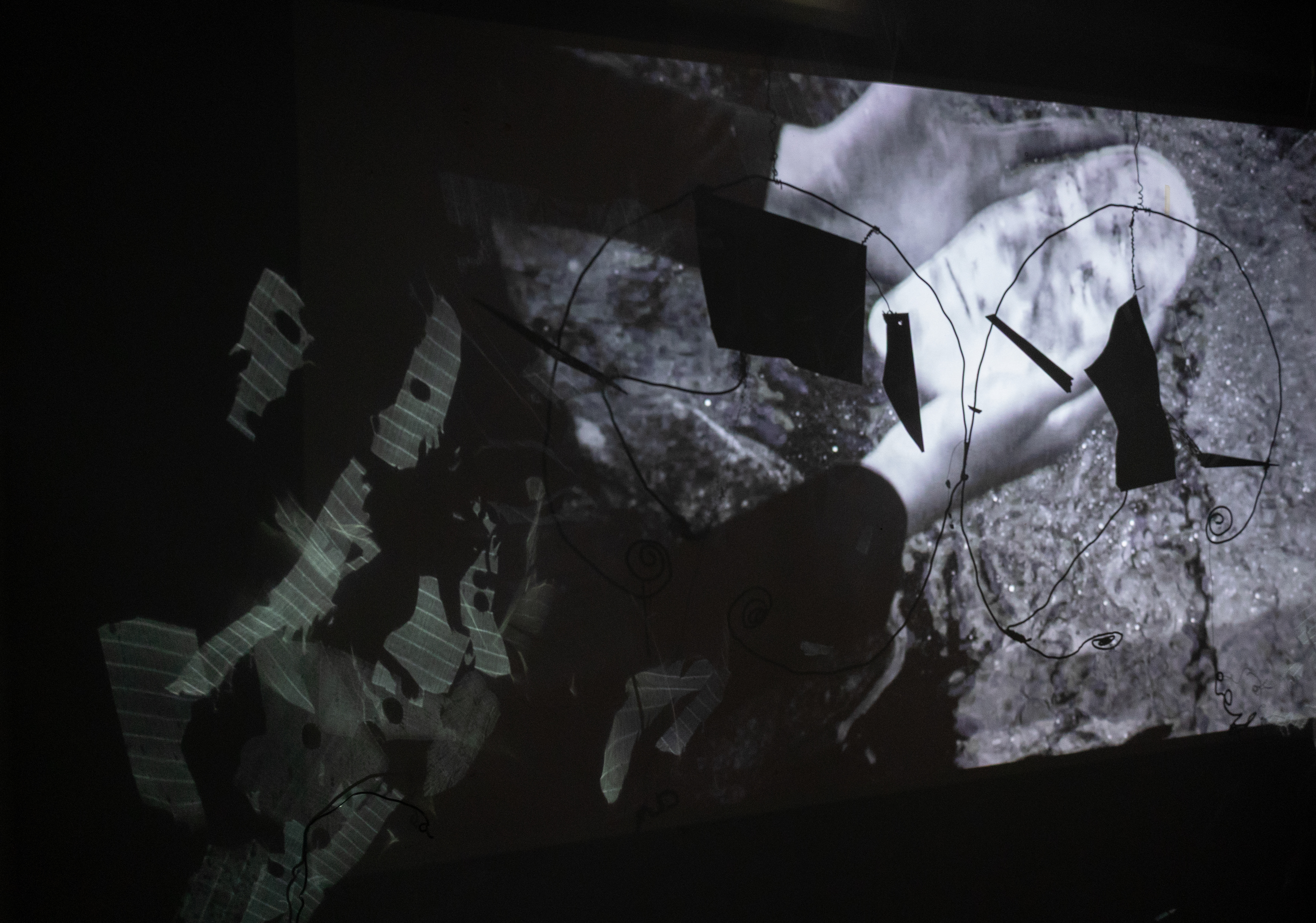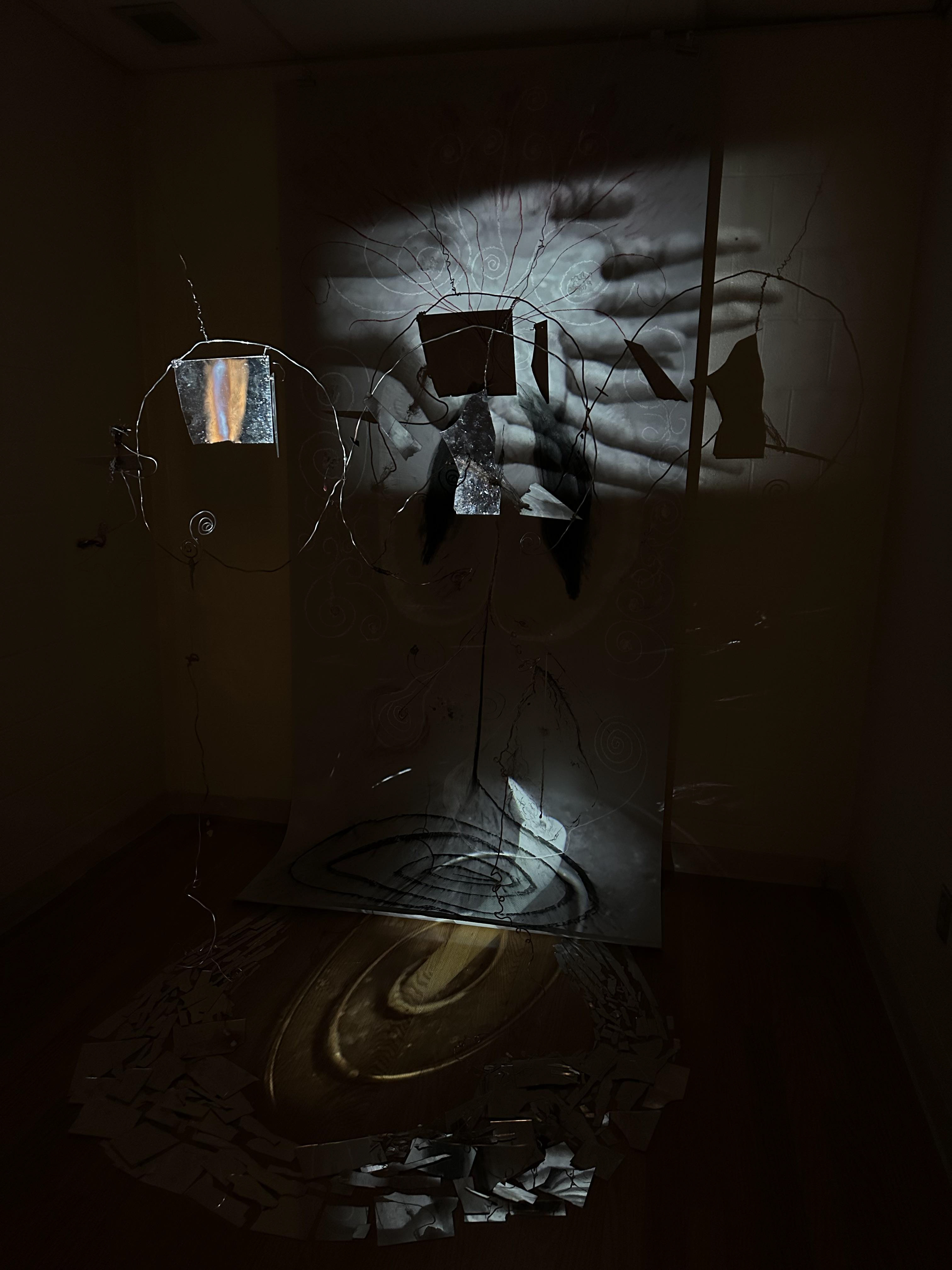 Installation: video projection, metal-wire, hair, stone beads, broken mirrors, candle wax, pencil, charcoal, and sage ash.